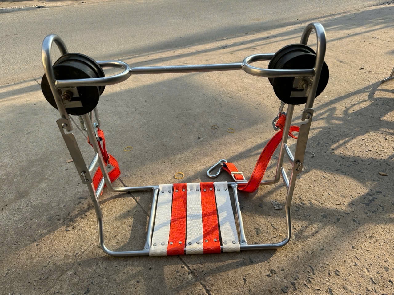 “Ghế ra dây” cho đường dây cao thế (còn gọi là ghế kéo dây hoặc ghế treo ra dây) là thiết bị dùng để hỗ trợ công nhân khi kéo và lắp đặt dây dẫn hoặc cáp quang trên các cột điện cao thế.